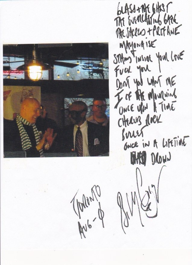 Earnie Banks and Billy Corgan of the Smashing Pumpkins, Historic Setlist and signed by Billy (copy of original setlist). Price includes shipping.
